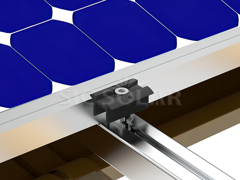 6️⃣ تثبيت الألواح الشمسية: استخدم المشابك المركزية والطرفية لتثبيت الألواح الشمسية على القضبان.