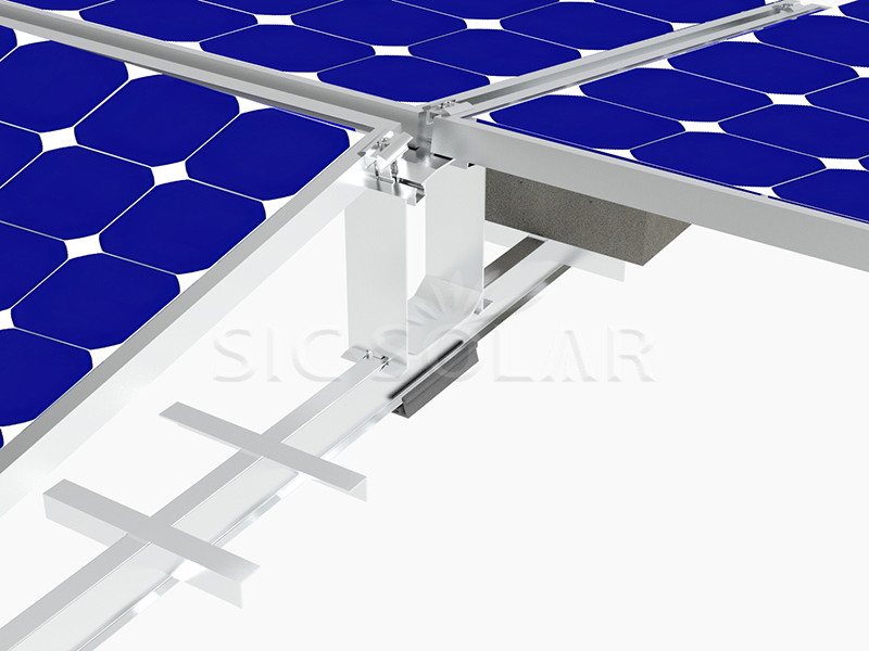 تركيب ألواح الطاقة الشمسية المصنوعة من الألومنيوم ثنائي الإمالة مُصمم لتركيب الألواح الشمسية على الأسطح المسطحة أو في الأراضي المفتوحة، بحيث تكون الألواح متجهة نحو الشرق أو الغرب. يستخدم النظام دعامات الصابورة دون اختراق السقف، مما يجعله مثاليًا لحماية سلامة السقف وتحسين إنتاج الطاقة.