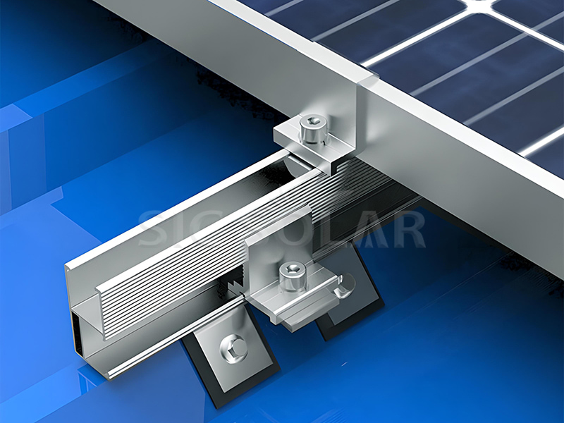 4️⃣ قم بتثبيت قضبان التثبيت - قم بتأمين قضبان الألومنيوم بالمشابك باستخدام البراغي والغسالات، وقم بمحاذاتها لضمان وضع اللوحة بدقة.